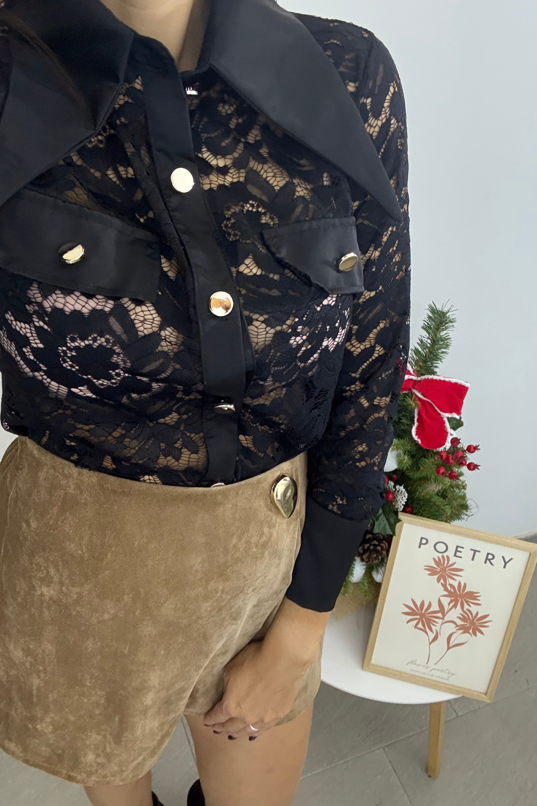 Esta camisa de encaje está confeccionada en un tejido delicado y sofisticado, ligero al tacto y con una transparencia sutil que aporta elegancia sin esfuerzo. Es una prenda que embellece cualquier look, ideal tanto para noches especiales como para combinaciones más chic durante el día.