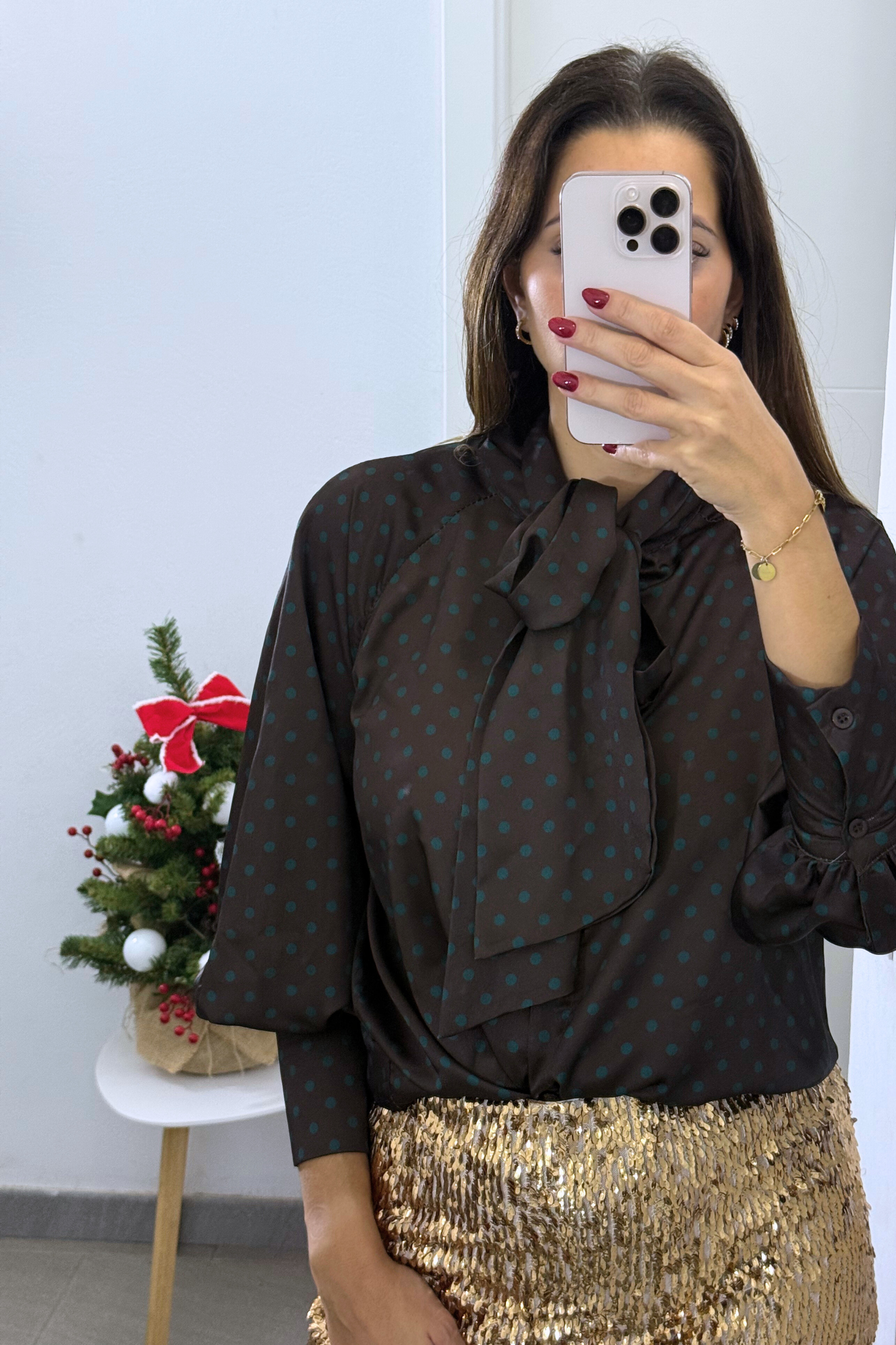 Esta camisa de lunares es una prenda llena de encanto, pensada para mujeres que buscan un estilo sofisticado con un toque delicadamente femenino. Confeccionada en una tela fluida tipo satén, su caída suave y luminosa envuelve la silueta con elegancia y movimiento.