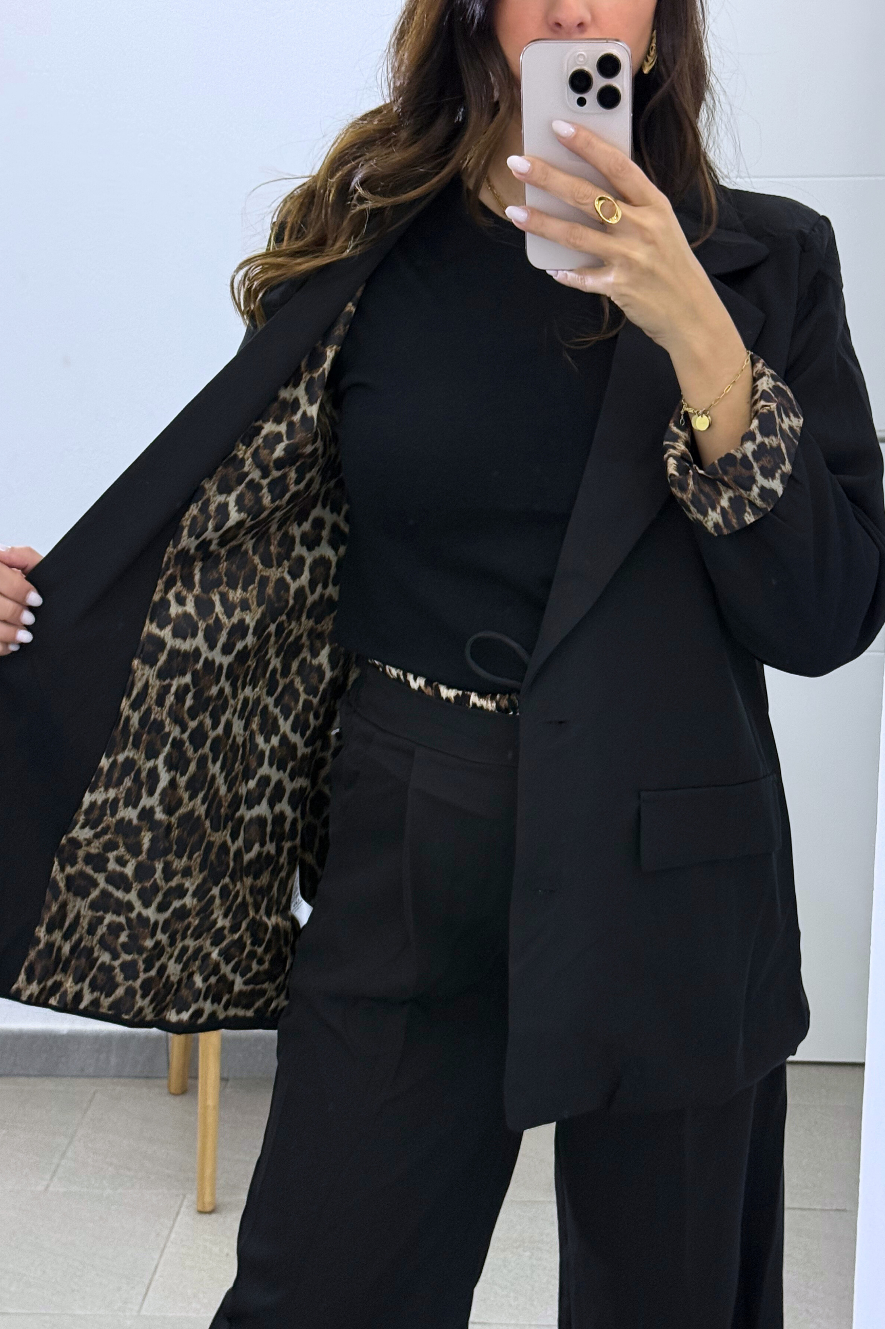 El forro interior con detalle animal print aporta contraste y un acabado especial que marca la diferencia, convirtiéndolo en un conjunto único. Su diseño crea una silueta equilibrada y favorecedora, perfecta tanto para looks casuales como para outfits más arreglados. Además, puedes llevarlo junto o por separado, multiplicando las posibilidades en tu armario.