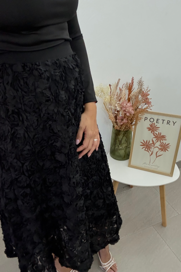 Una prenda que combina elegancia y sofisticación con un toque romántico y moderno. Su diseño con flores en relieve aporta textura y presencia, creando un efecto visual delicado y muy especial, ideal para eventos o looks de noche.