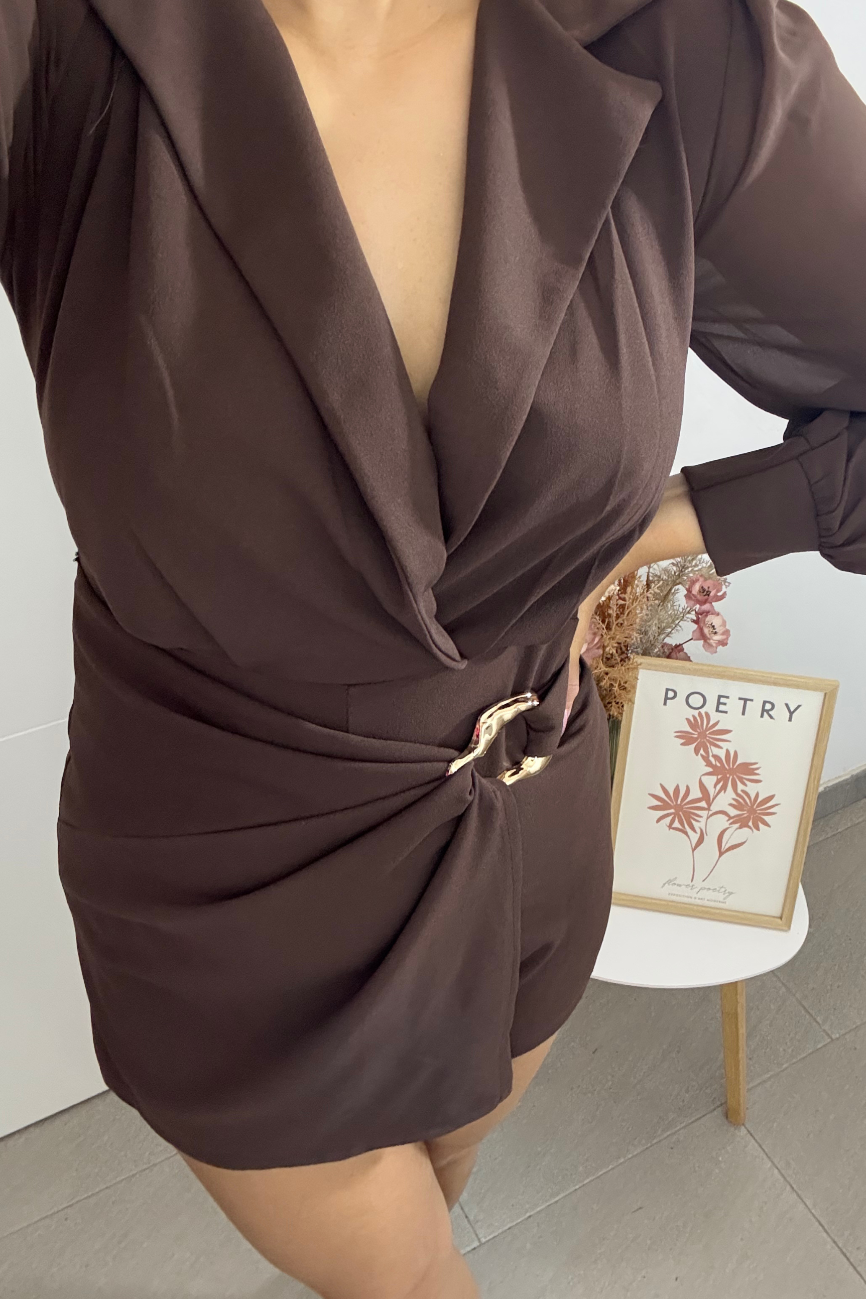 Este mono corto es la combinación perfecta entre sofisticación y comodidad. Su cuello tipo blazer estiliza el escote y aporta un aire muy elegante, mientras que las mangas transparentes añaden un toque delicado y sofisticado que lo convierte en una prenda especial.