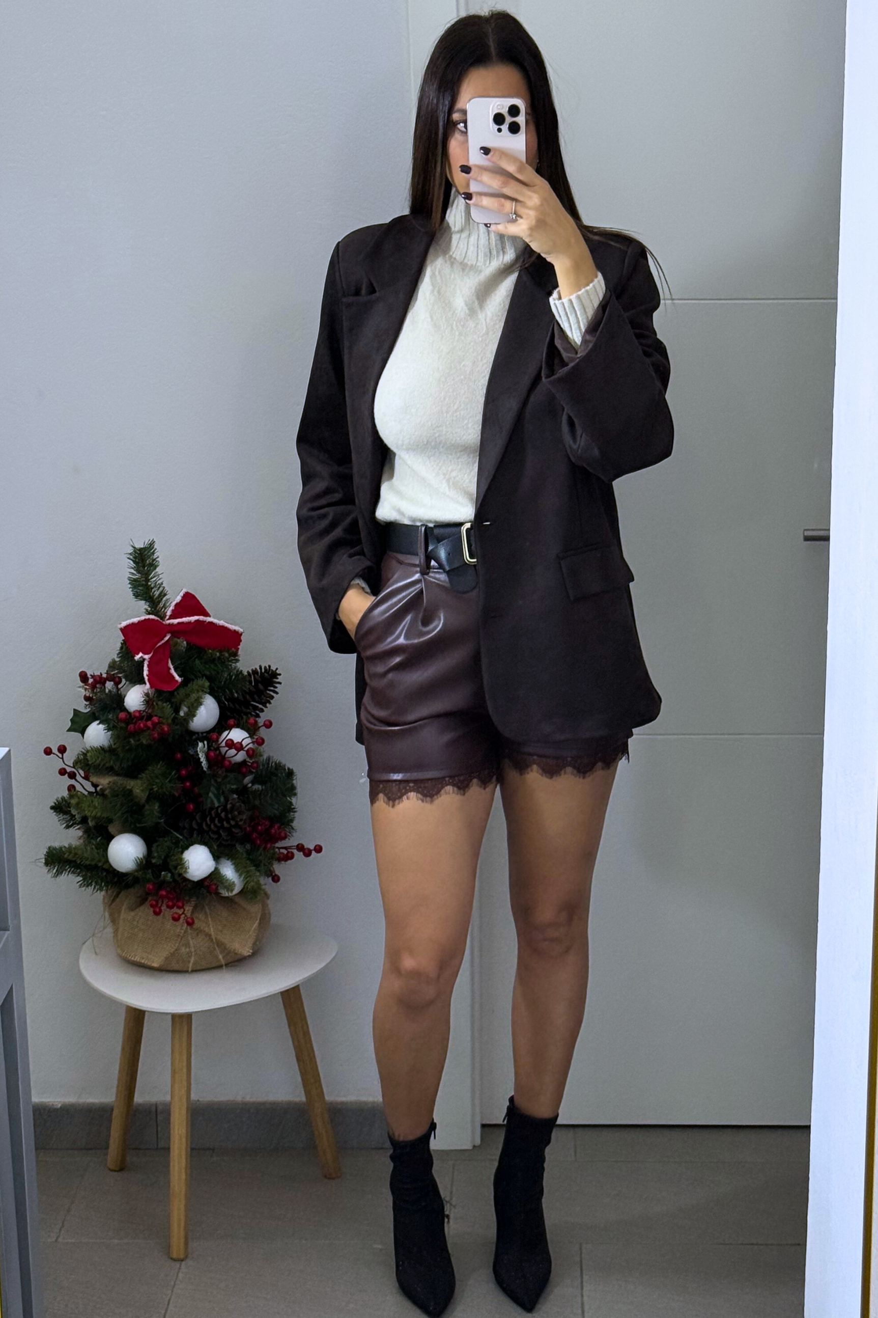 Pero lo que realmente lo hace especial es el bajo acabado en encaje. Ese contraste entre la dureza del cuero y la delicadeza del encaje crea un efecto romántico, sugerente y muy femenino, convirtiendo el short en una prenda única y con personalidad.
