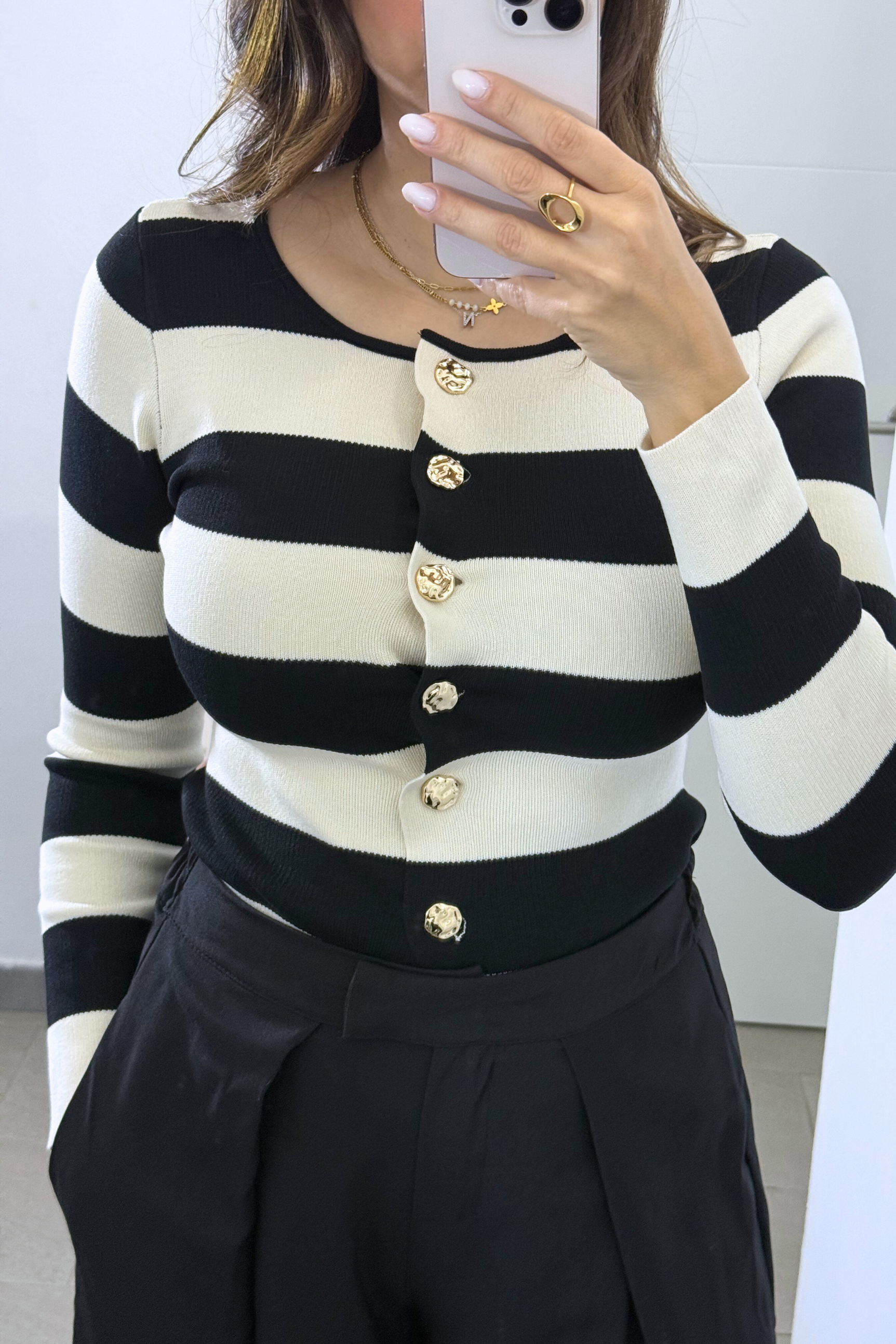 Rebeca Alma es esa prenda especial que transforma cualquier look en un instante. Atemporal, sofisticada y con carácter, destaca por su diseño de rayas en contraste y sus delicados botones joya dorados, que aportan un toque chic y luminoso tanto de día como de noche.