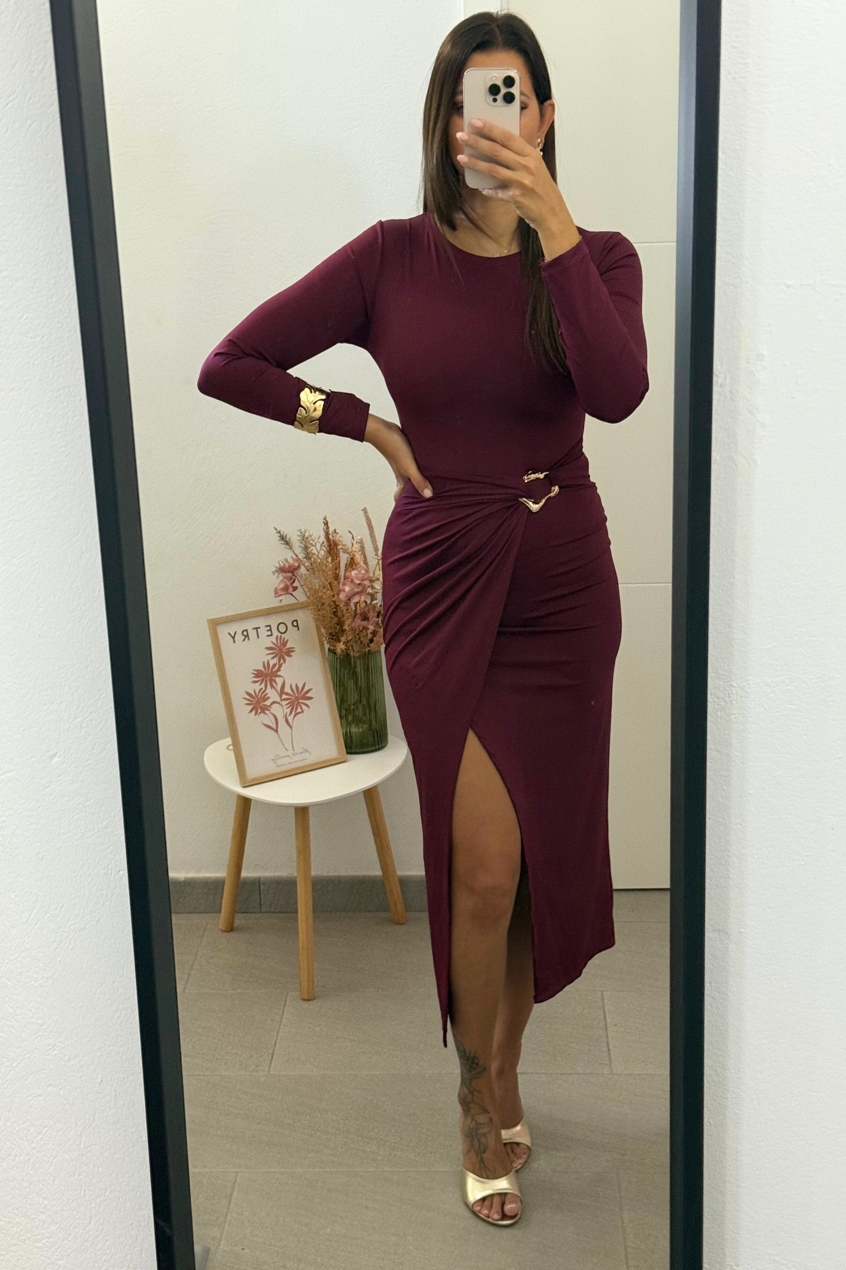Este vestido de corte entallado es una prenda diseñada para realzar tu figura con elegancia y sutileza. Su drapeado lateral crea un efecto estilizador que afina la silueta y aporta un toque sofisticado, sin renunciar a la comodidad.