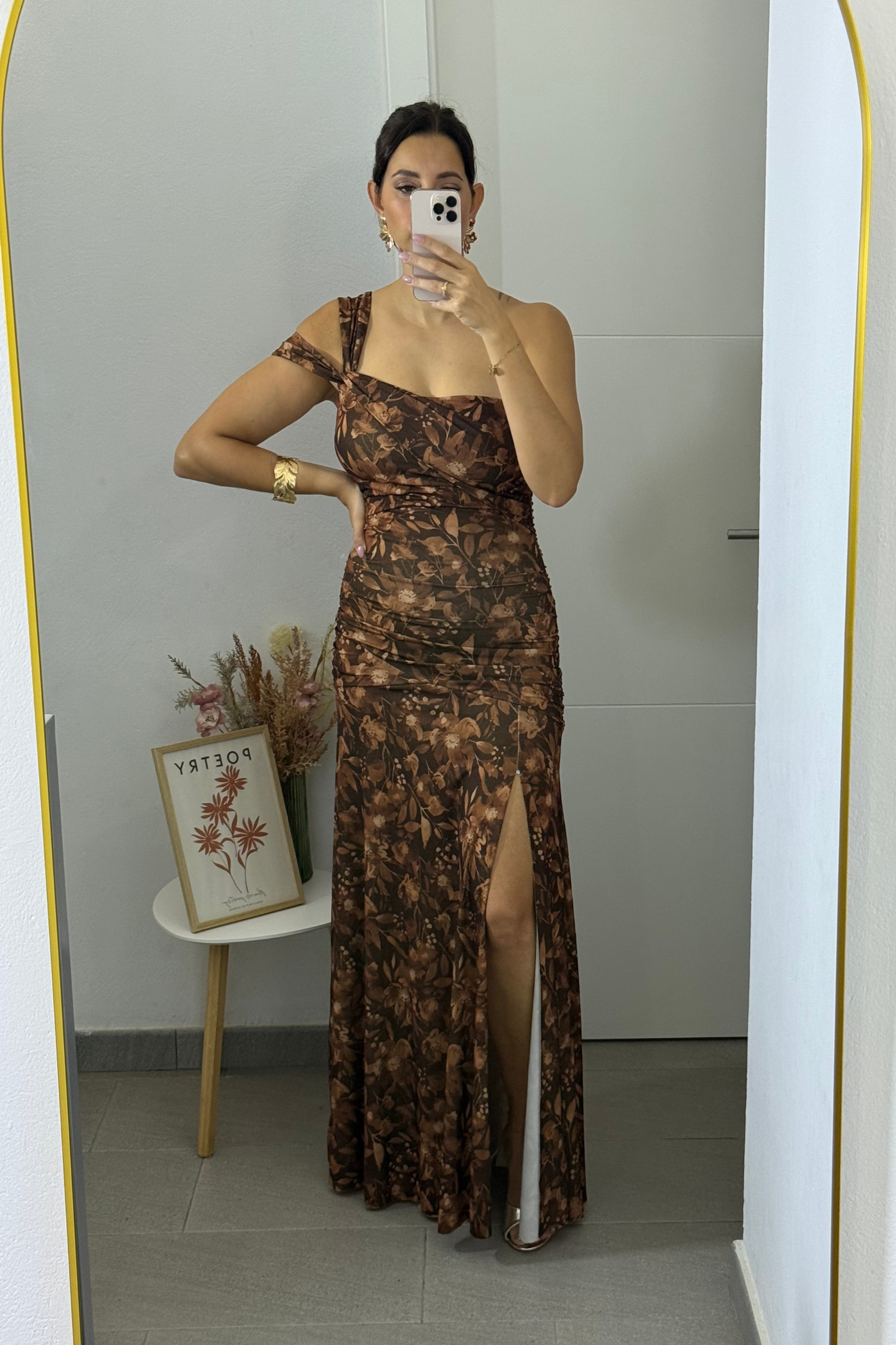 Vestido largo elástico, escote asimétrico de doble tirante y falda fluida con abertura lateral. Talla única (ajusta hasta 40)